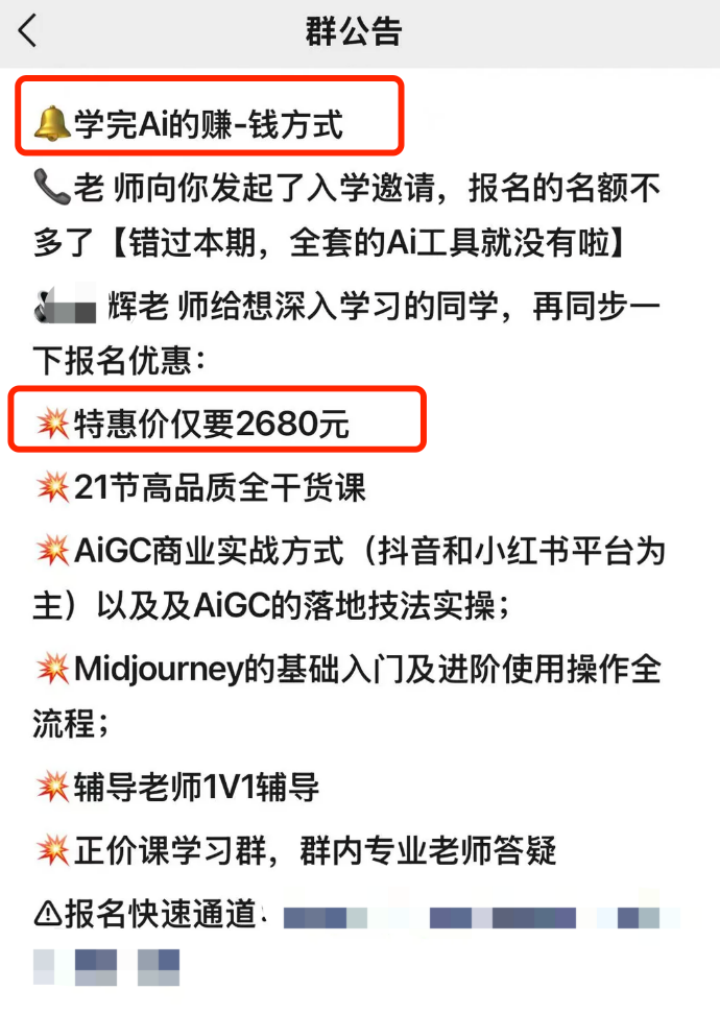 与此同时群里学习氛围空前火热,有的同学刚刚发出自己的“收益成果”截图,加上老师逼单策略稍稍一催化,互联网又多了一个苦学AI的老年人。